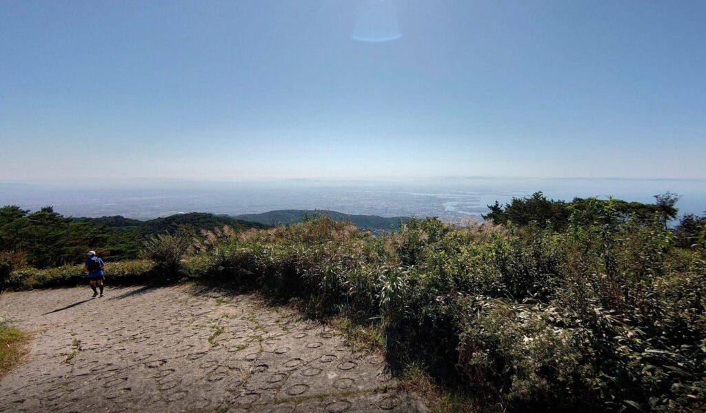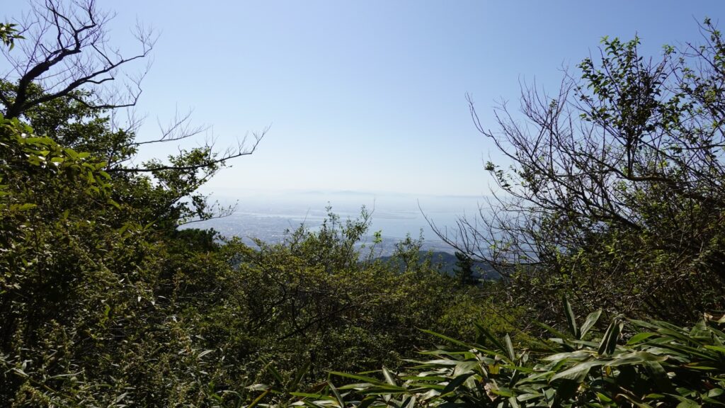 「六甲山最高峰」標高931mからの景色も堪能しましょう。ここが本当の六甲山の山頂、一番高いところで「一等三角点」には931.13メートルと書かれています。西宮辺りから六甲山系の北側の景色もよく見えていますね。
