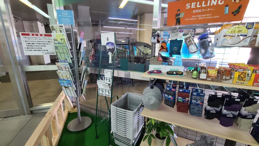 登山、トレッキングに必要なグッズを販売。山登りの前に、あ、あれ忘れた!って時もここに来れば安心。(オープン当時の写真なので現在とは商品が異なります。)