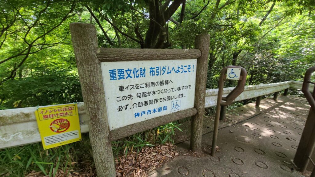 車椅子でも介助者同伴だとOK。勾配がきつくと書かれています。結構坂の勾配はきついので、足腰の弱い方、体力に自信のない方は、逆コース、つまり新神戸駅から布引の滝→布引貯水池→神戸布引ハーブ園へと向かう上りがメインのコースは避けておいたほうがいいですよ。