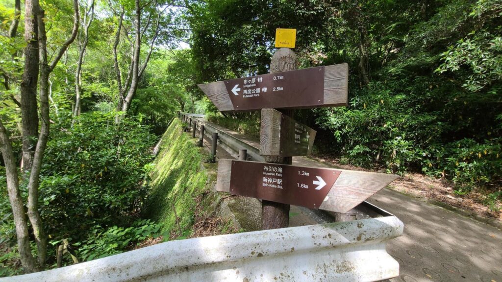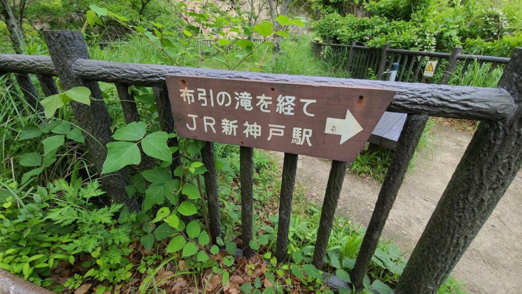 少し歩くとこの分岐点に。右へ進むと再度公園のほうに行くことができます。布引の滝、新神戸駅方面は左手へ。