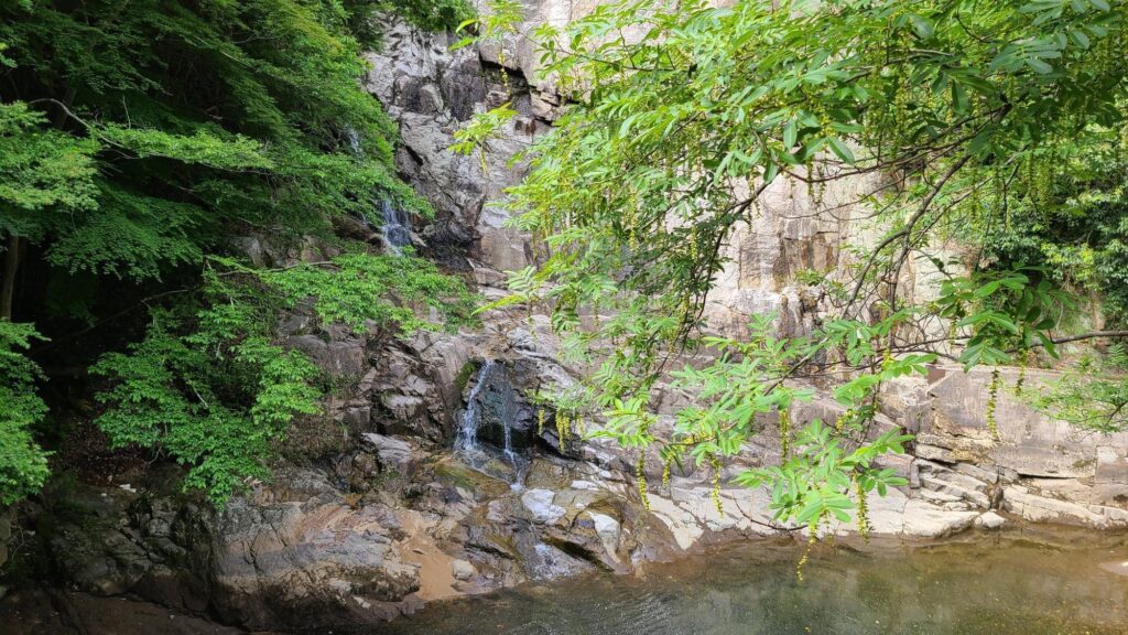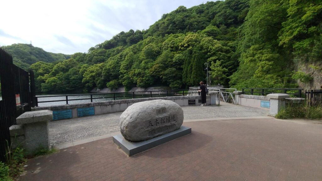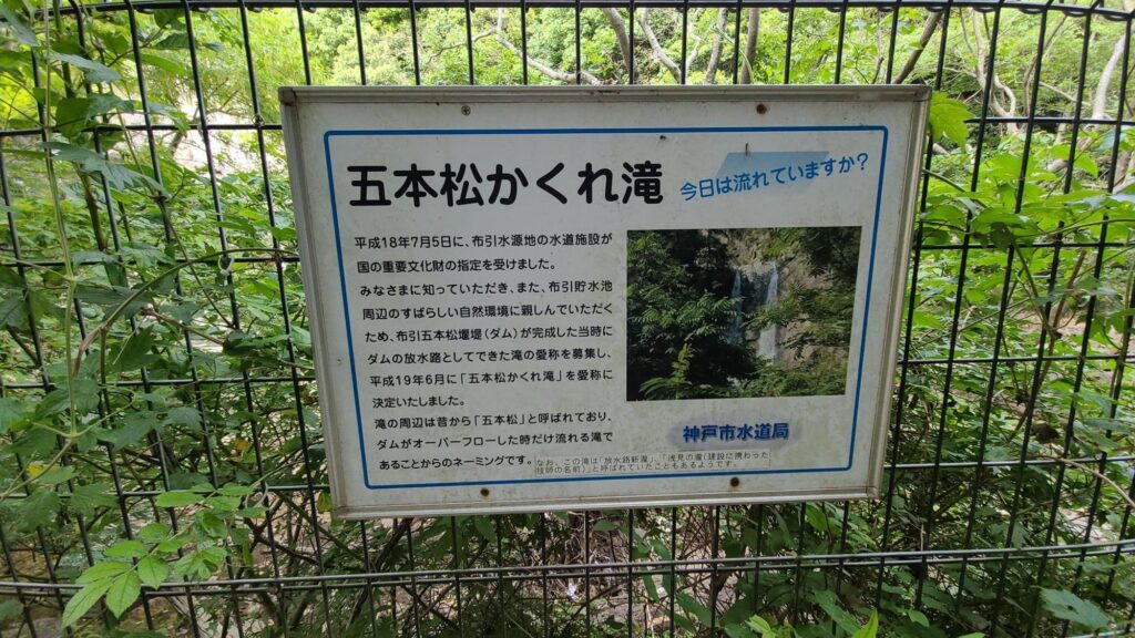 ダムの近くには五本松かくれ滝があります。雨が降って、上流の布引五本松堰堤が満水、放流時のみ流れる滝で「幻の滝」とも言われています。