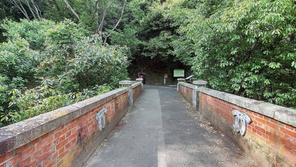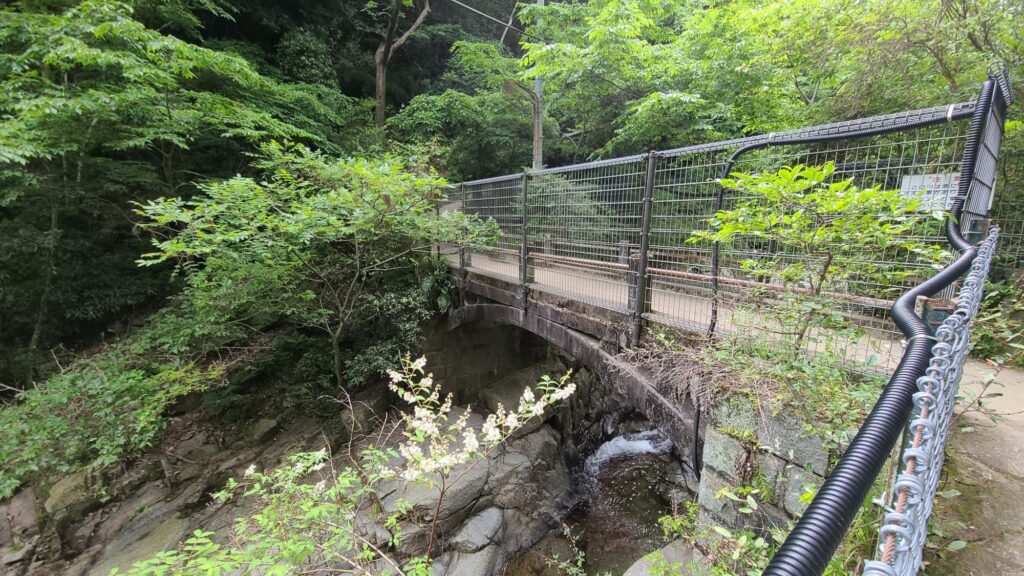 ハイキングコースの入口に到着。このレンガ積の砂子(いさご)橋も明治33年(1900年)に造られた布引水源地水道施設の一つで、国の重要文化財に指定されています。