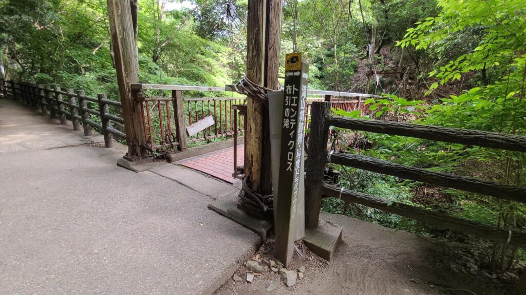 少し進むと、徳島県の祖谷のかずら橋をモチーフに造られた猿のかずら橋が見えてきますが、この橋を渡らないようご注意を。橋を右手に見ながら真っ直ぐ進みます。