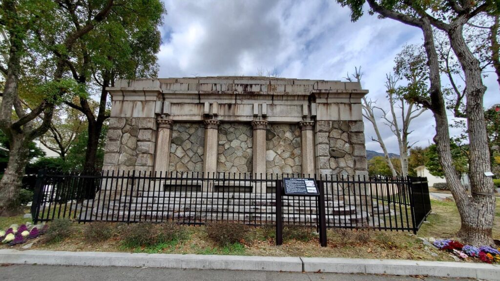 銅像は、当初は湊川神社本殿の横に設置されていました。しかし、日露戦争の講和条約の内容に憤慨した群衆に引き倒されてしまいました。そして、1909年にハルピンで伊藤博文が暗殺された後、親交のあった大倉喜八郎が改めて銅像を再建。伊藤博文の銅像自体は、第二次世界大戦で金属供出されたことで台座だけが残っています。