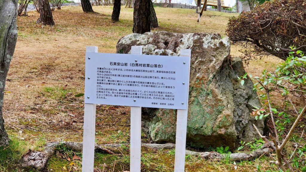 白馬村の天然記念物で、2000万年前に海底火山から放出された石英安山岩だそうです。