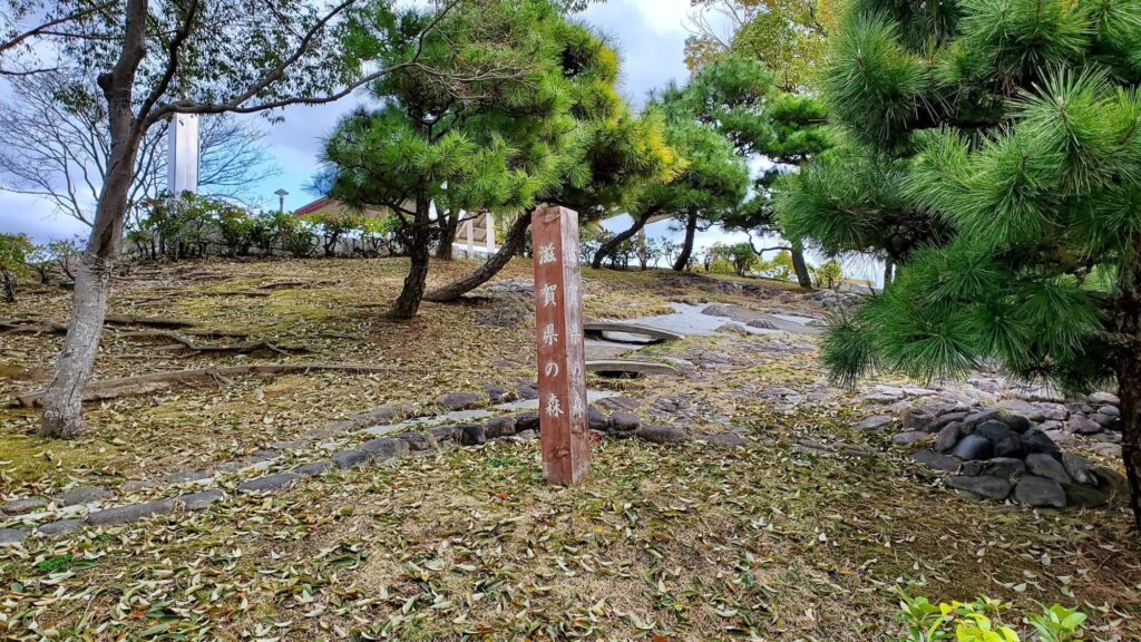アングルは北から南を眺めたところですが、細くなってるところにはちゃんと琵琶湖大橋も架かってますよ。琵琶湖をマツ林と県の木であるもみじが囲んでいます。