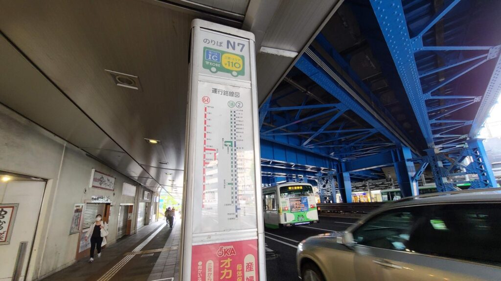 向かいに阪急神戸三宮駅が見える高架下あたりにバス停があります。「92」系統はこのバス停から乗車。少し先に「2」「18」「64」系統のバス停もあります。