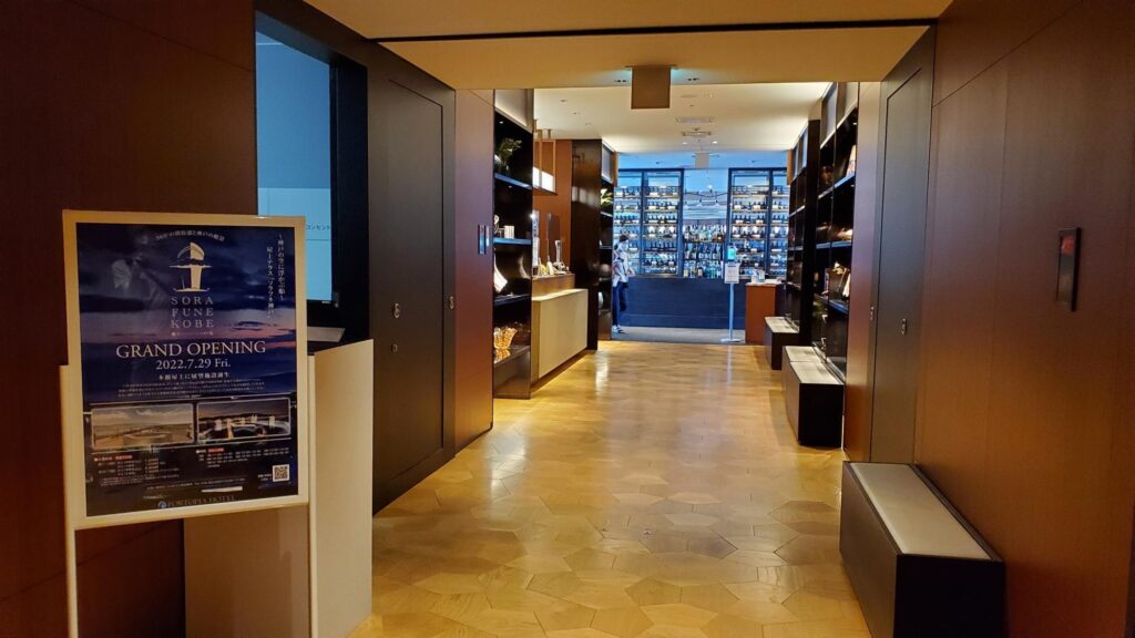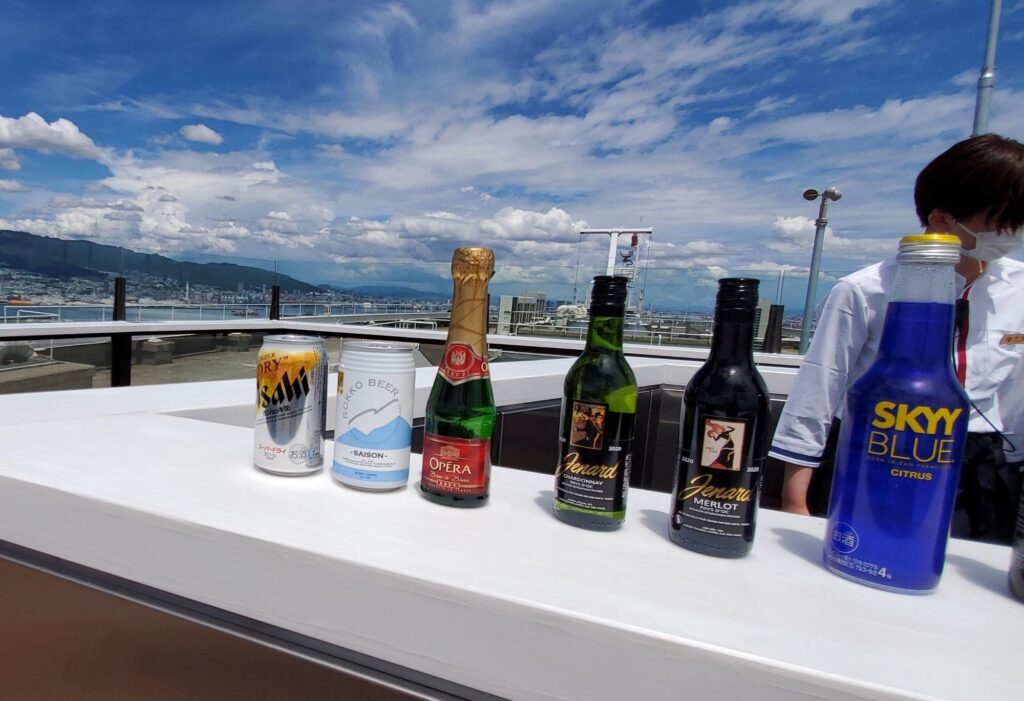 バーカウンターのメニューは、アサヒ生ジョッキ缶、六甲ビール セゾン、オペラブリュット、ジュナール シャルドネ 白ワイン、ジュナールメルロー、スカイブルーシトラス、神戸ウォーターレモネード、クラフトコーラ、ブラッドオレンジソーダ、スムージーマンゴーなど。お酒だけでなくノンアルコールドリンクも用意されています。(2022年7月現在)