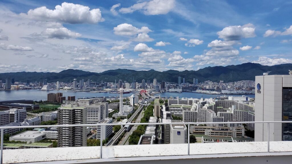 神戸沖の人工島、ポートアイランドの中心に立つ絶好のロケーションが、この360度の絶景ビューを生み出しています。