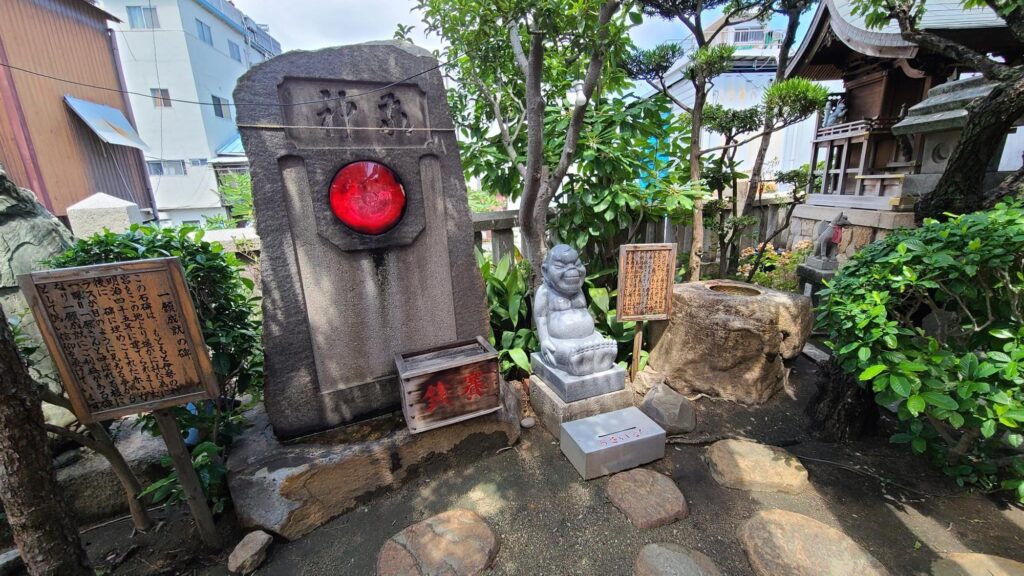 これは1912(明治45)年に建立された「一眼成就の碑」というもので、もともとは遥か遠くの伊勢神宮を碑を通して拝むための遥拝碑でした。赤く丸いガラスが目のように見えることから「一眼=一願」。つまり、一願成就にご利益があるとされ、多くの参拝者から篤い信仰を受けるようになりました。