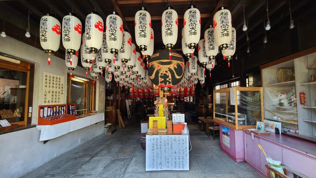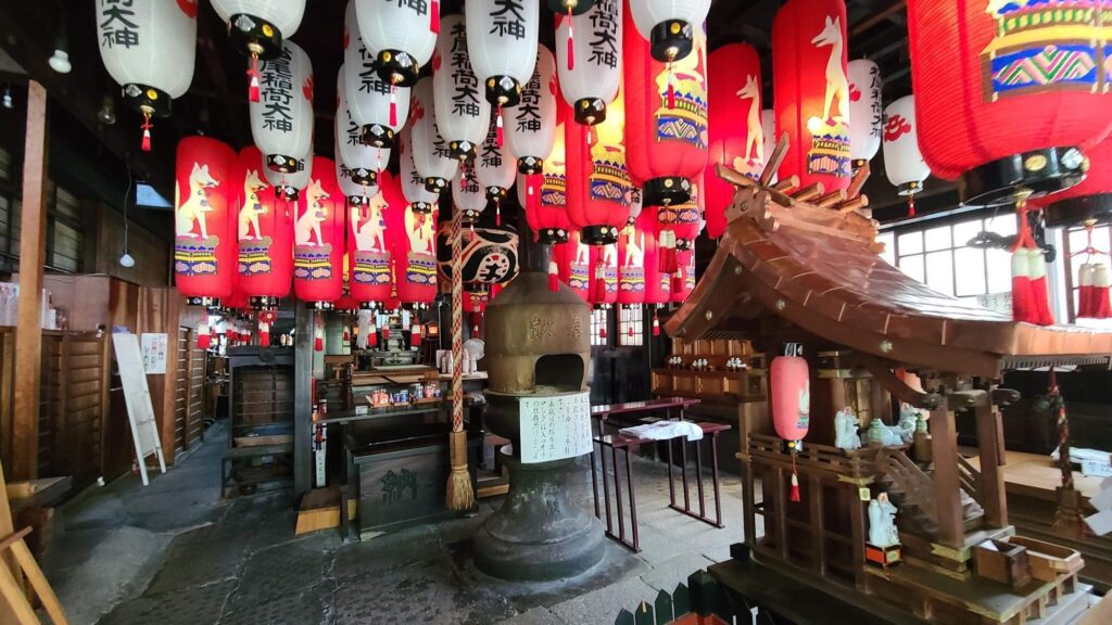 はい、こちらが本殿。たくさんの奉納提灯が吊り下げられ、その数に圧倒されます。「提灯持ちのお稲荷さん」とも呼ばれ、地元の人に親しまれています。