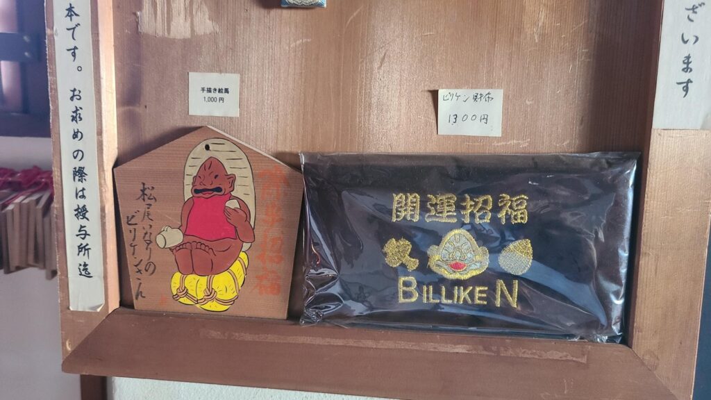 ビリケンさんが描かれた絵馬やお財布、お守りもあります。除災招福のご神徳に加えて、病気平癒、学業向上の御利益があるとされています。