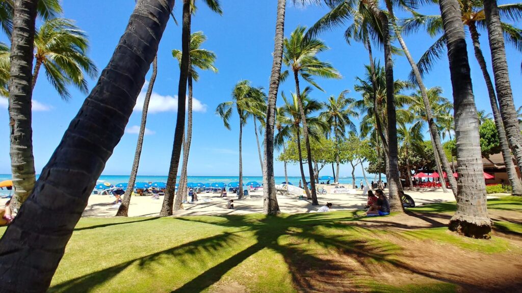 筆者はハワイに一度旅行したことがありますが、まさにこんな感じでした。沖縄も好きでよく行きますが、ここまでヤシの木がいっぱいあるところはないですね。