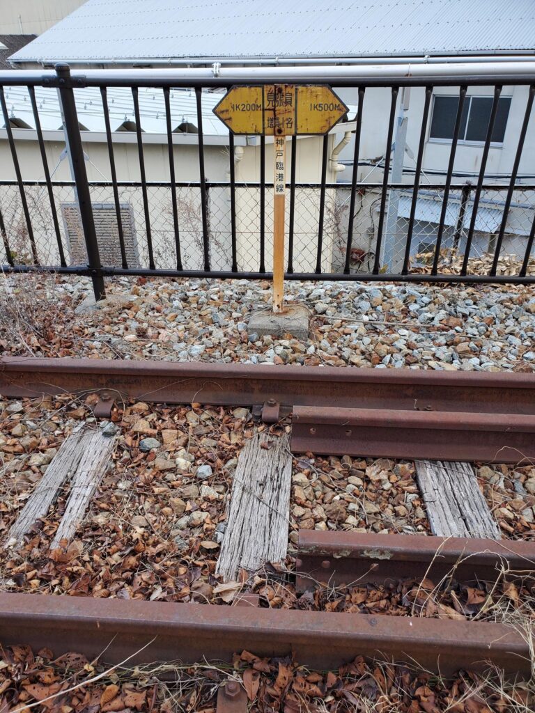 当時の線路がそのまま残されています。「神戸臨港線」という文字も見られます。