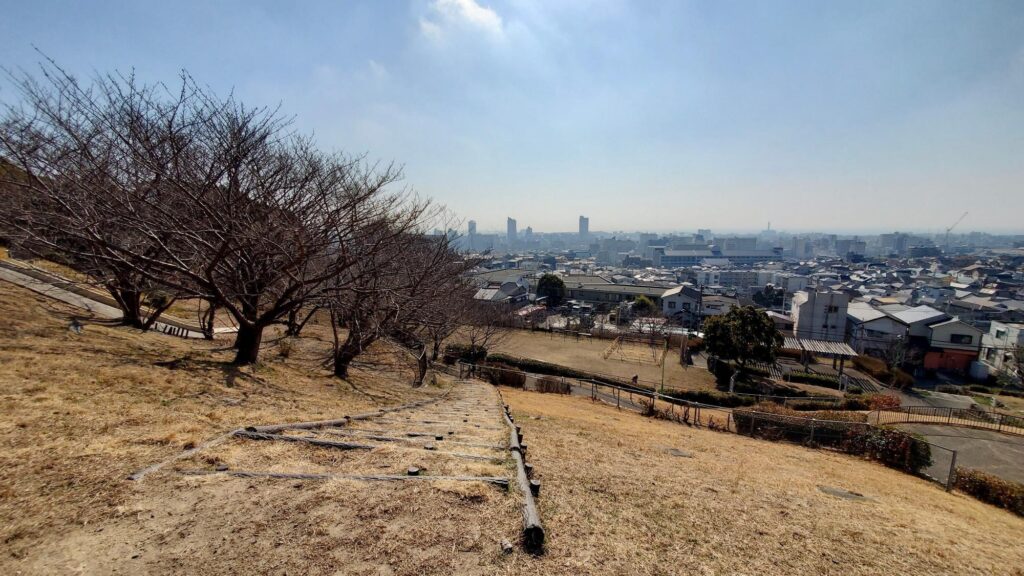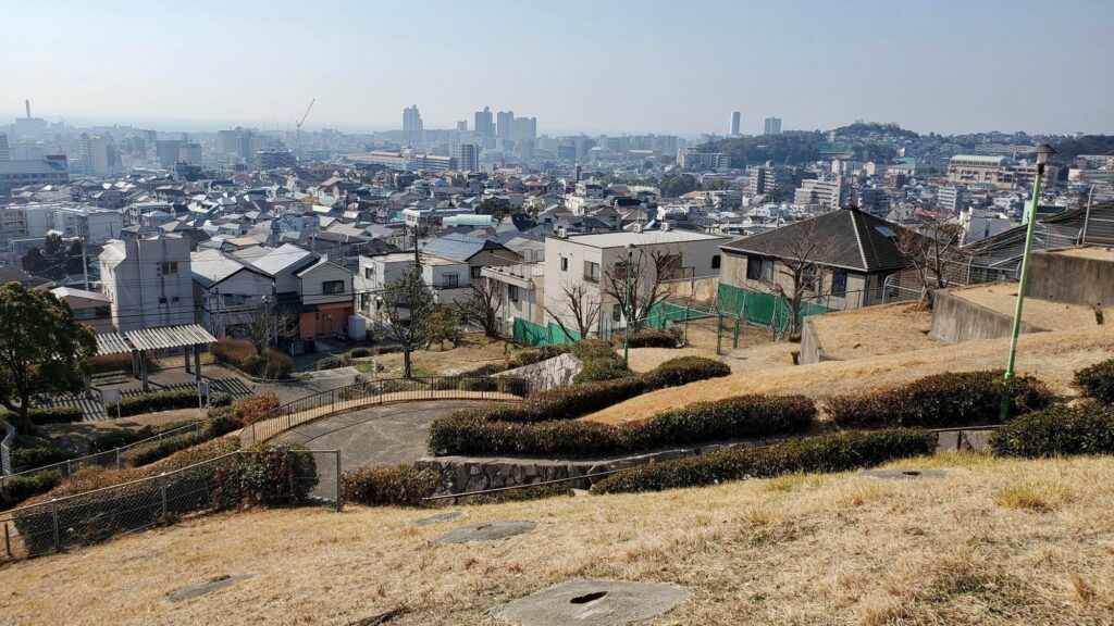 その公園の名称は「大丸山公園(だいまるやま)」。神戸電鉄長田駅から徒歩約15分ほどの長田区大丸町2丁目にあります。神戸朝日病院に近い北東の公園入口から坂道を上ると・・・