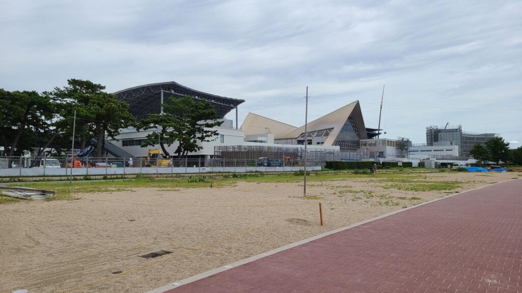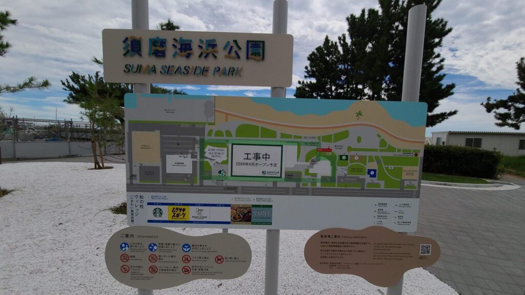 一番東端からは、建設中の神戸須磨シーワールドが見えます。2024年6月には公園東半分の整備が完了し、全面開業する予定。西日本で唯一シャチが見られる大型水族館「神戸須磨シーワールド」やイルカと触れ合えるリゾートホテル「神戸須磨シーワールドホテル」が誕生。公園内には新たなBE KOBEモニュメントも設置されます。