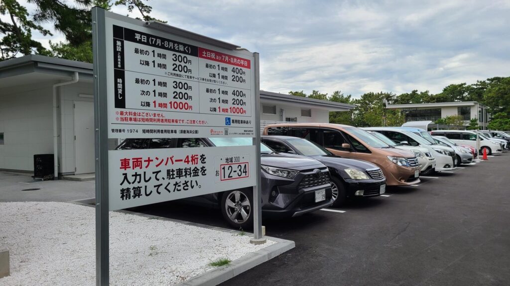 「松の杜ヴィレッジ」に近い国道2号線沿いに新しく駐車場も出来ています。最近よくある車両ナンバー自動読み取りタイプですが、精算時は車両ナンバー4桁を入力する必要があります。須磨海浜公園の東に従来からある駐車場も利用できます。こちらは2023年5月から事前精算機での精算方式に変わっていますのでご注意を。