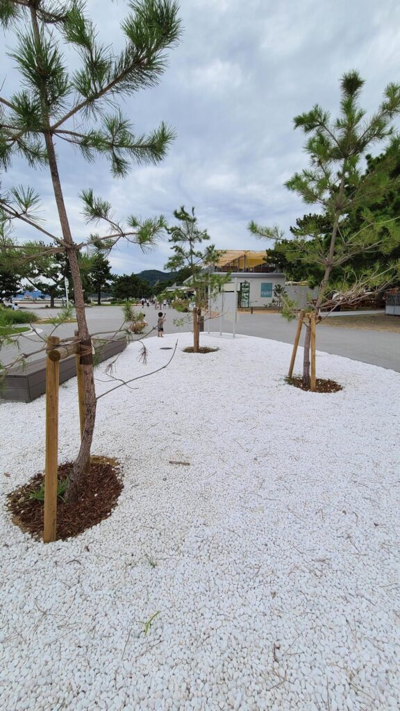 公園の入り口あたりと一番東のところには、白い石が敷き詰められ、松が植えられたスポットがあります。「松の杜ヴィレッジ」を象徴するかのようなスポットで、とてもいい雰囲気。