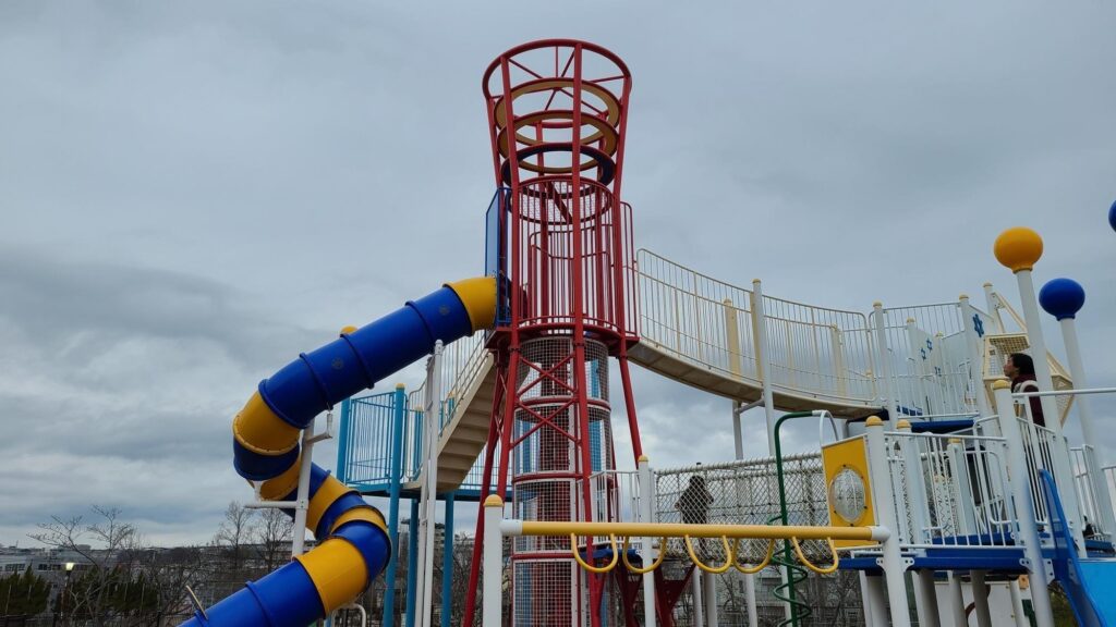 下の青く波のような形の遊具は海を表現しているのかも。