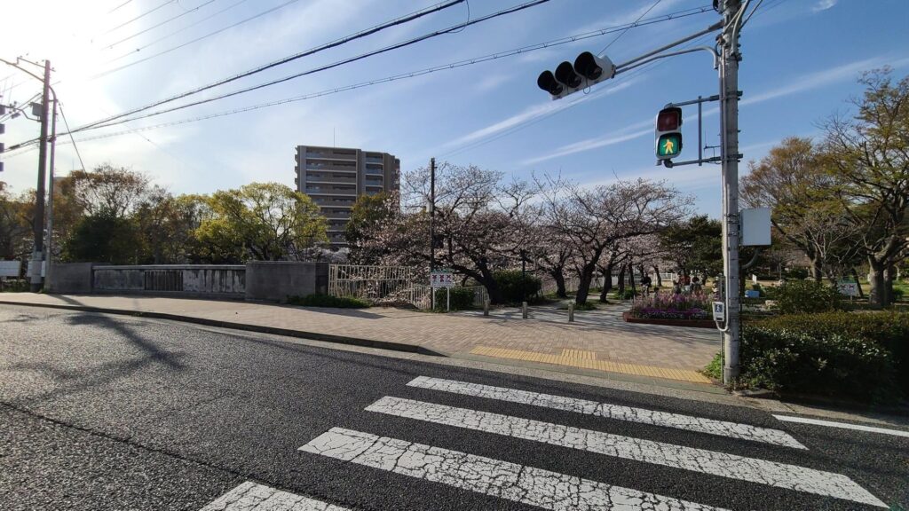 須磨警察署前の信号を渡ると公園はすぐそこ。(写真は過去満開だった時のもの)